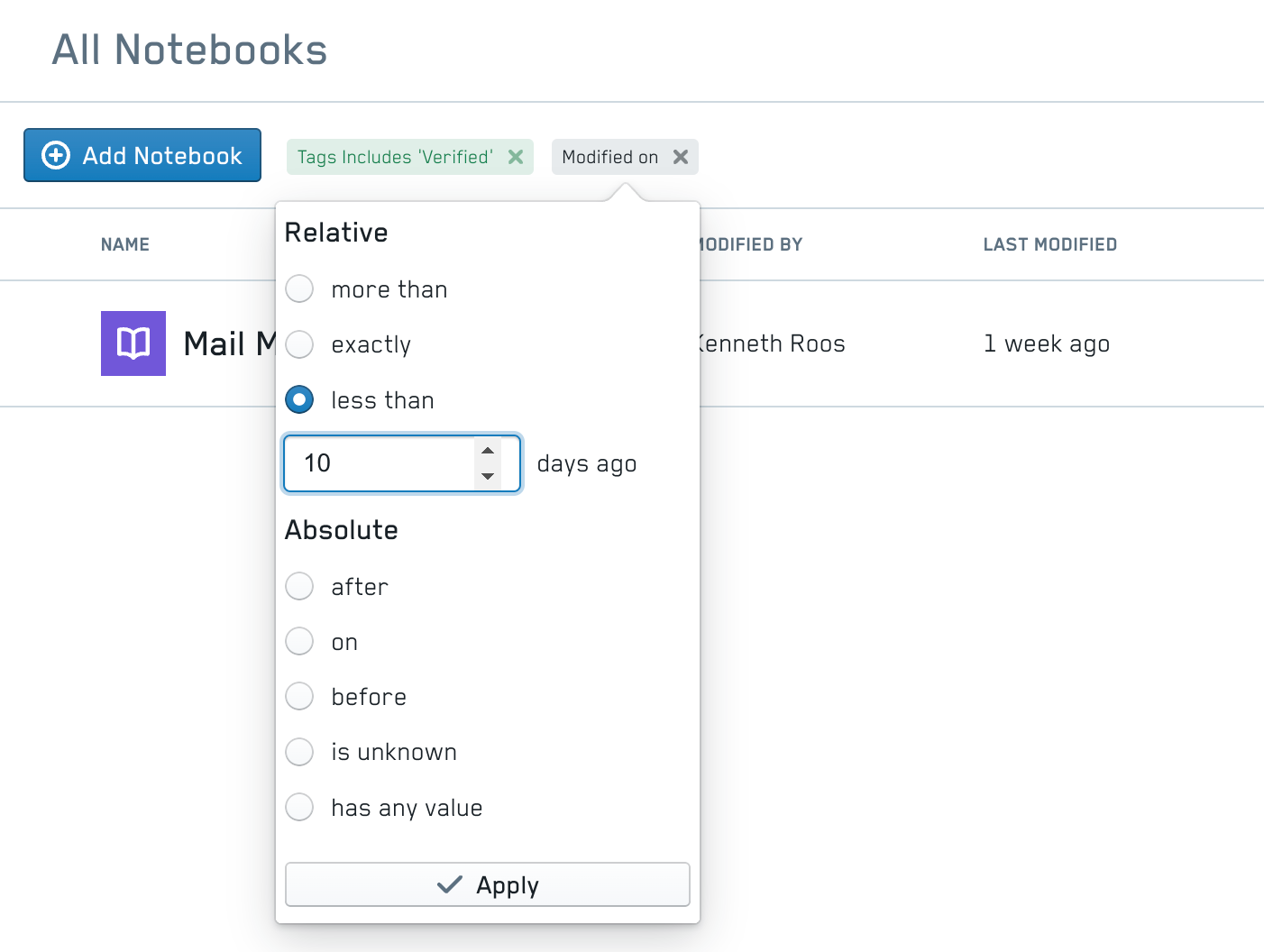 Multiple filter criteria can be combined to create useful filter selections, for example, you can only show notebooks with the tag Verified that have been updated in the last 10 days.