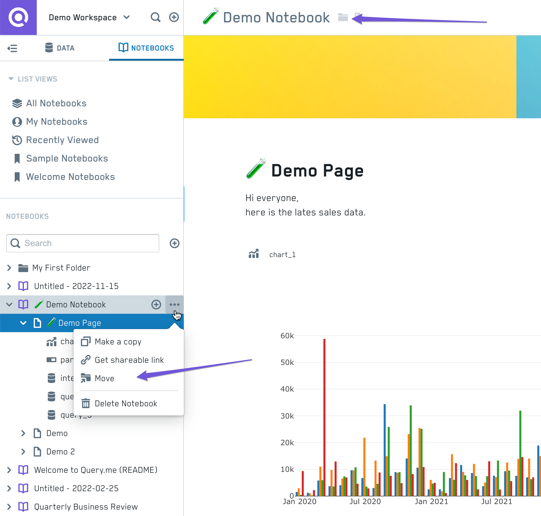 Access the folder moving feature from the Sidebar or the Notebook Header