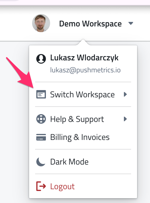 If you are a member of multiple workspaces, you can switch between them using the workspace switcher in the top navigation. Select the workspace you want to work in, and PushMetrics will load that workspace's content.