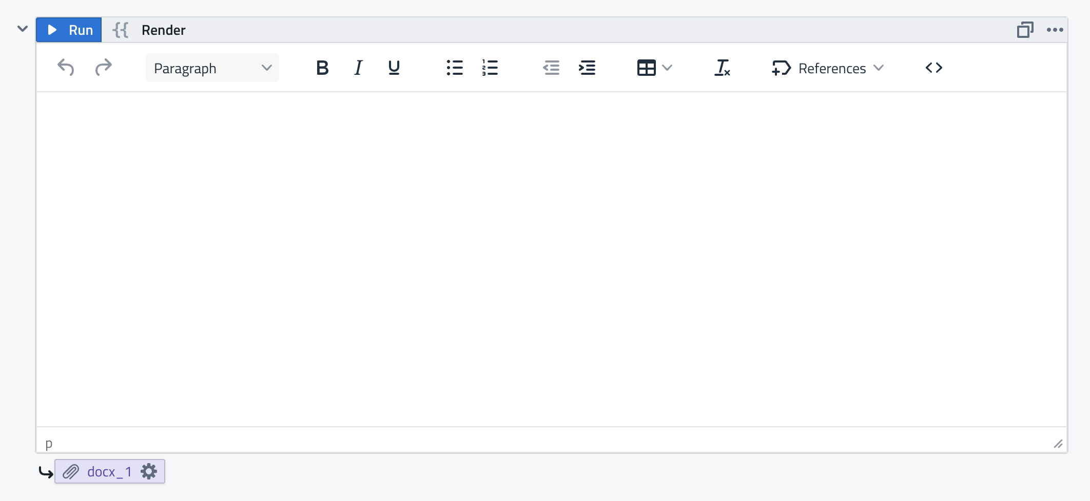 The Render block combines a rich text editor with Jinja templating to produce .docx files: