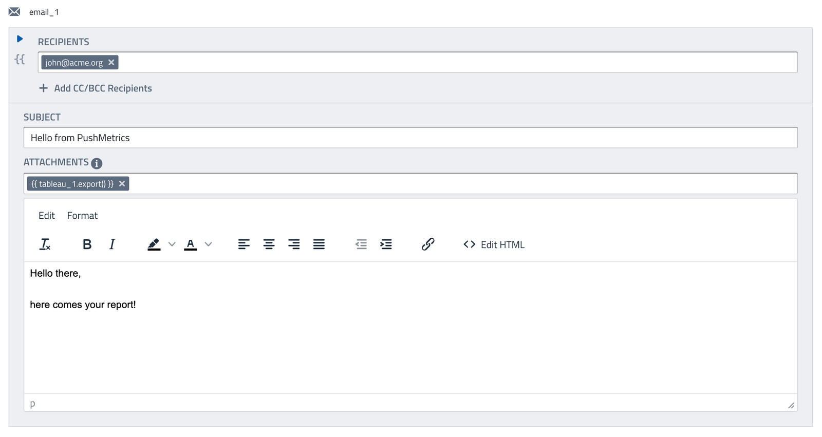 Note: Sending large files via email is generally not recommended, consider sending download links instead. - Email Body: The Editor allows many formatting options and outputs HTML emails. For full customization of the design, click on "Edit HTML".