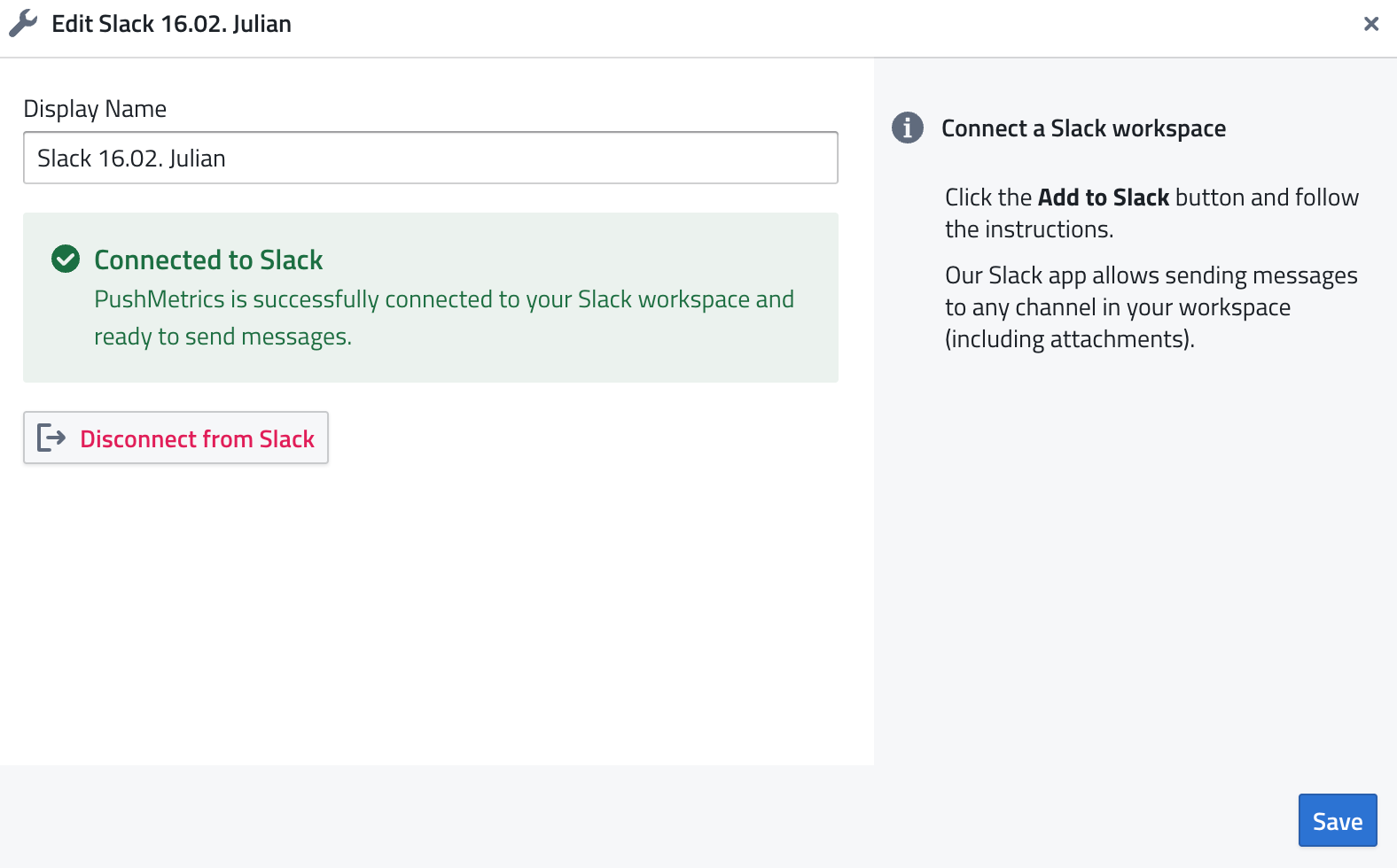 Users can disconnect the Slack App directly from within PushMetrics: