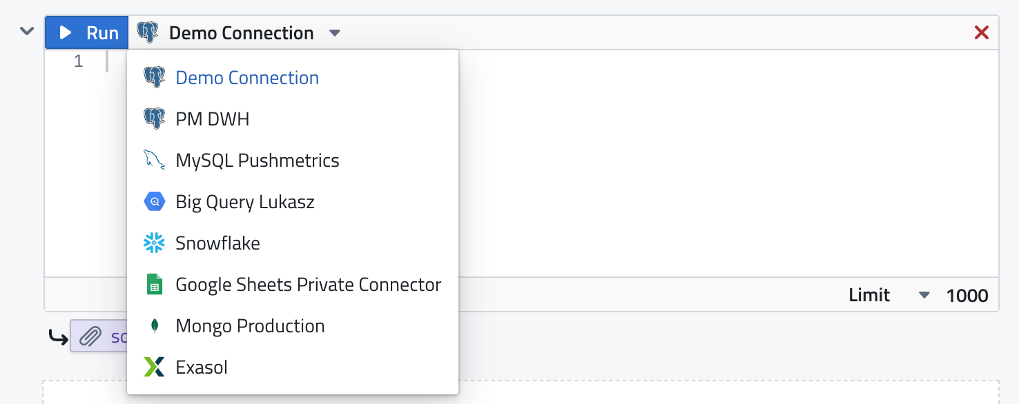 To create the SQL attachment, click on the SQL button. This will create a SQL block that you can then use to write a query and run.