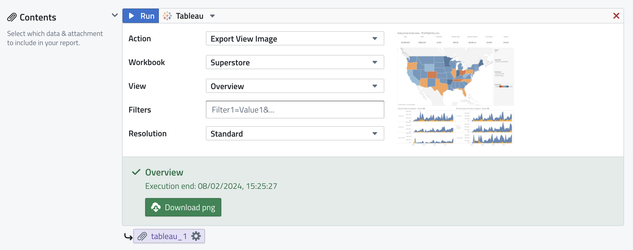 The report we create will send out the result of a SQL query along with an Image export of a Tableau View attached to an Email.