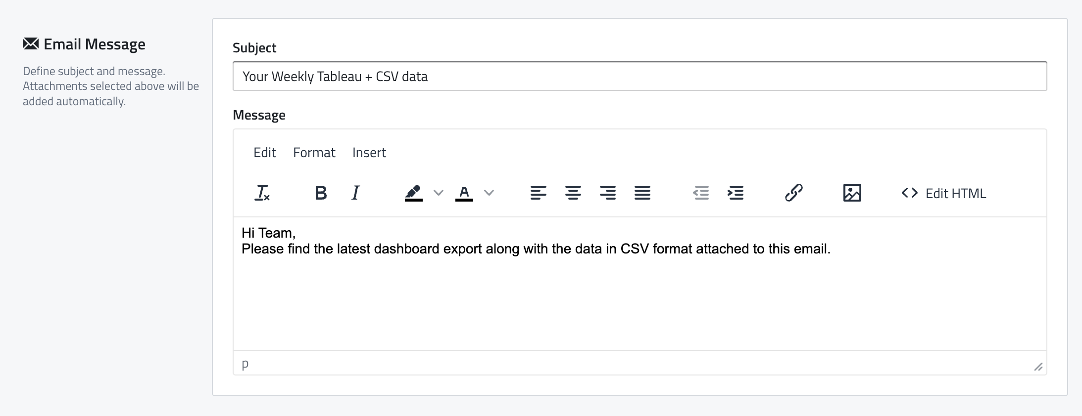 To send a message body along with your attachment you have all the bells and whistles in our Message Editor.