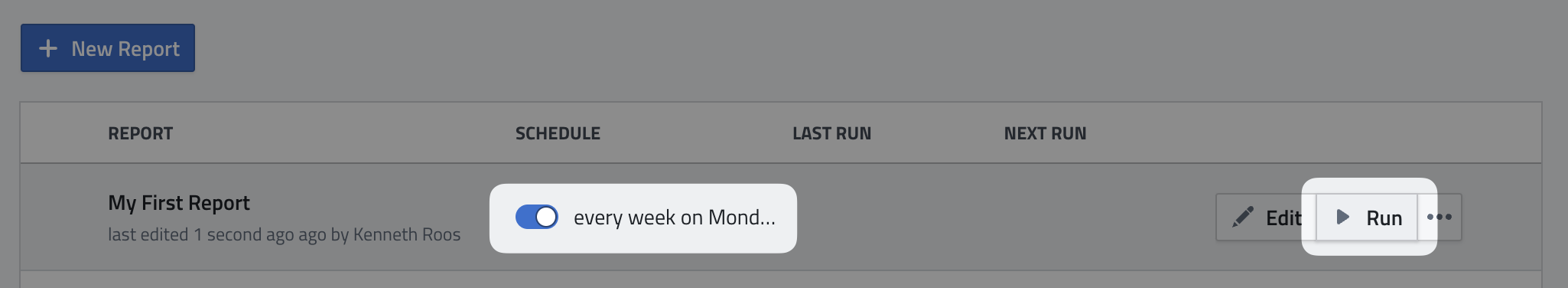 This will take you back to the reports list, from where you can manually run it for testing. And also flip the switch to activate it.