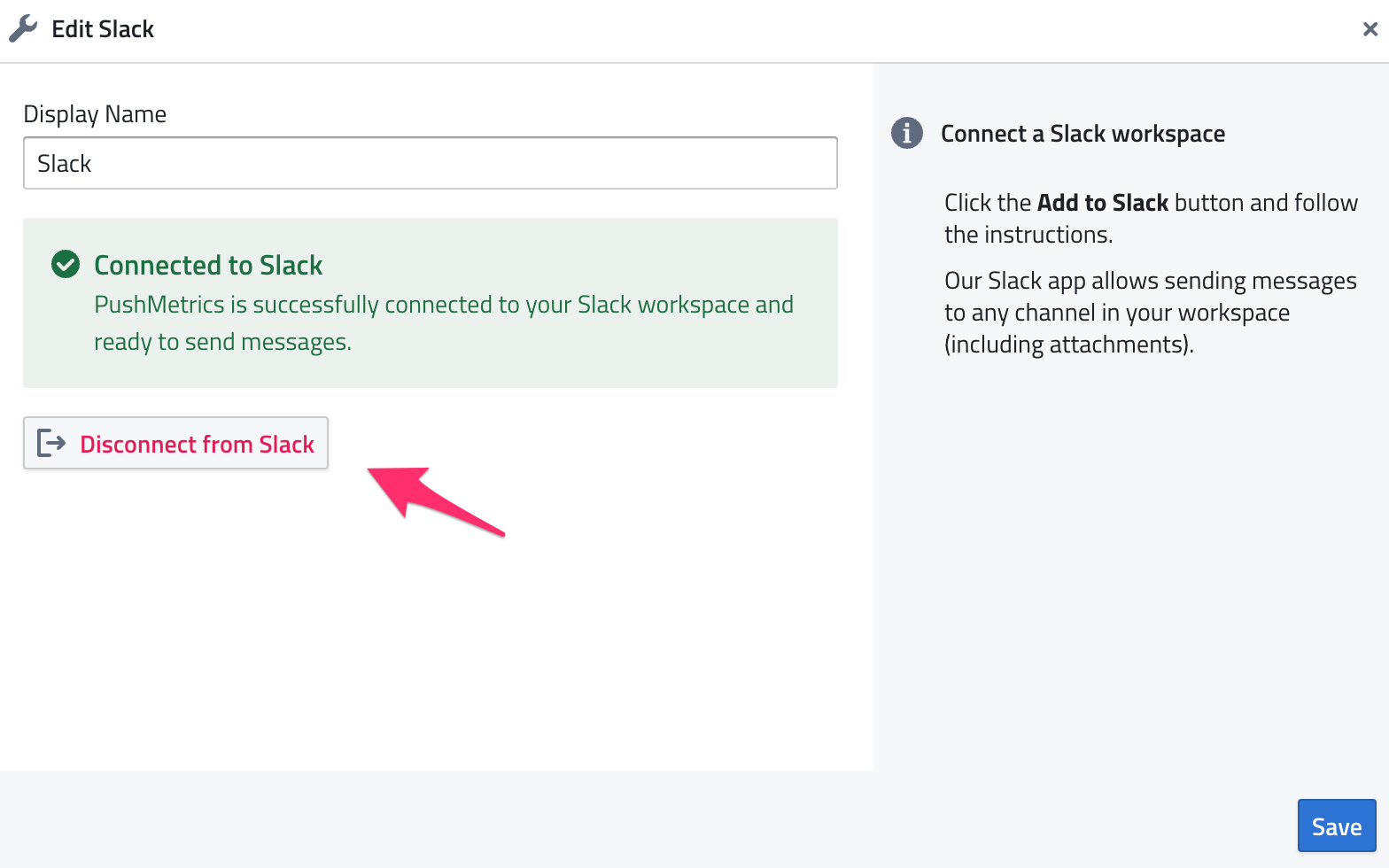 From the integration edit screen, click the red Disconnect from Slack button to revoke the Slack token and unlink the app while keeping the integration entry in PushMetrics.